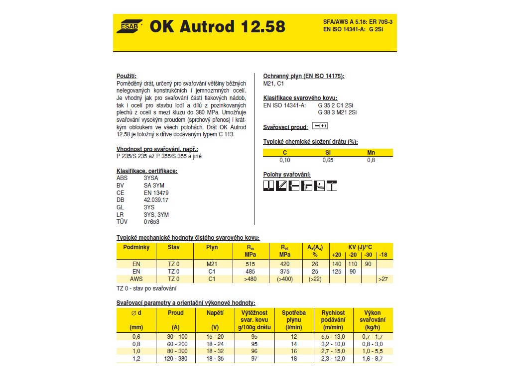 i ocelí pro stavbu lodí a dílů z pozinkovaných plechů z ocelí s mezí kluzu do 380 MPa. Umožňuje svařování vysokým proudem (sprchový přenos) i krátkým obloukem ve všech polohách. Drát OK Autrod 12.58 je totožný s dříve dodávaným typem C 113.
