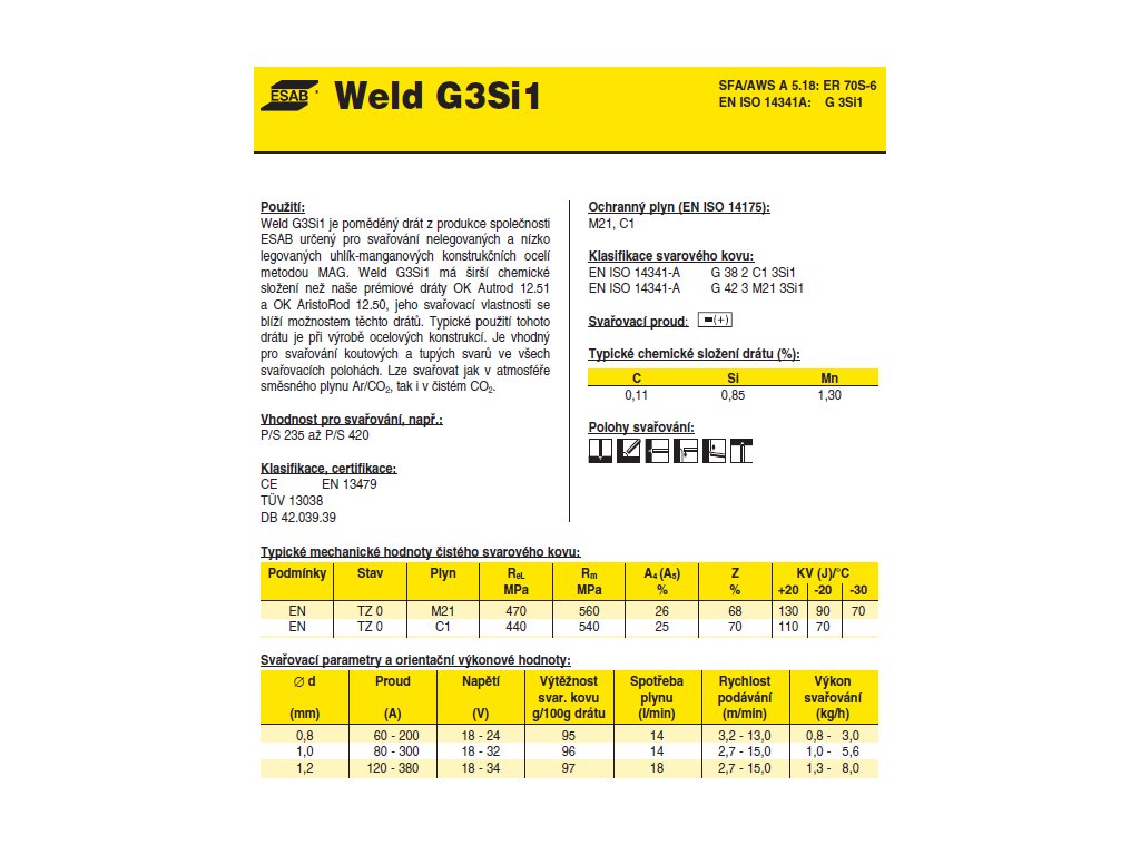 Weld G3Si1 je poměděný drát z produkce společnosti ESAB určený pro svařování nelegovaných a nízko legovaných uhlík-manganových konstrukčních ocelí metodou MAG. Weld G3Si1 má širší chemické složení než naše prémiové dráty OK Autrod 12.51 a OK AristoRod 12.50, jeho svařovací vlastnosti se blíží možnostem těchto drátů. Typické použití tohoto drátu je při výrobě ocelových konstrukcí. Je vhodný pro svařování koutových a tupých svarů ve všech svařovacích polohách. Lze svařovat jak v atmosféře směsného plynu Ar/CO2, tak i v čistém CO2.