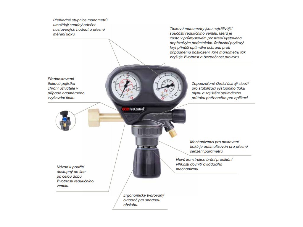 Redukční ventily řady GCE ProControl mají robustní konstrukci, vhodnou pro každodenní použití v zastřešených dílnách, ale i pro venkovní provoz. Jejich vertikálně orientovaná konstrukce zvyšuje bezpečnost při manipulaci. Materiál použitý pro výrobu redukčních ventilů je vždy zvolen tak, aby vyhovoval kompatibilitě s konkrétním typem plynu. Každý redukční ventil je před opuštěním montážní linky individuálně nastaven a otestován. Všechny redukční ventily byly navrženy, vyrobeny a otestovány v Evropě s využitím více než stoletých zkušeností skupiny GCE s výrobky tohoto typu. Zároveň jsou však při celém procesu od návrhu až po výrobu uplatněny i nejnovější technické poznatky. Redukční ventily GCE ProControl splňují požadavky stanovené normou ISO 2503.